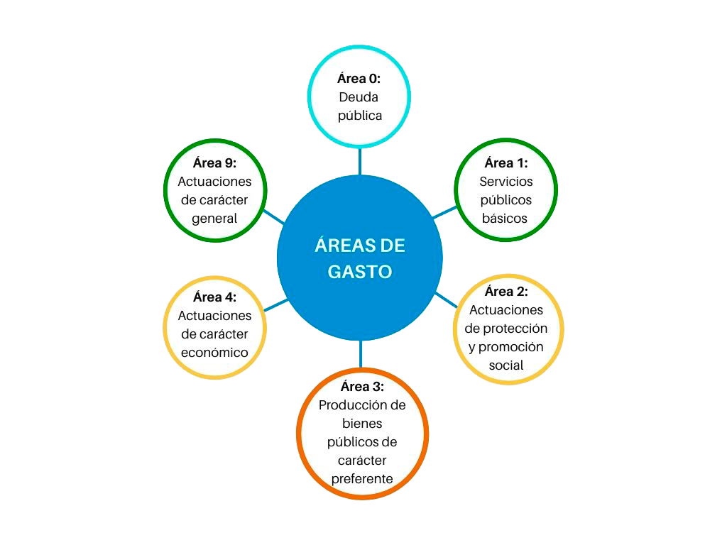 As áreas de gasto integran políticas de gasto, que son á súa vez grupos de programas e finalmente programas. Os programas orzamentarios integran conxuntos de créditos destinados á mesma finalidade. As áreas de gasto son as seguintes.